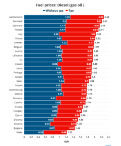 For diesel, the overall tax burden is lower, averaging 44.6% in the EU. Only four countries have taxes exceeding 50%: Malta (54.3%), Italy (51.1%), Ireland (50.6%), and Slovenia (50.1%).