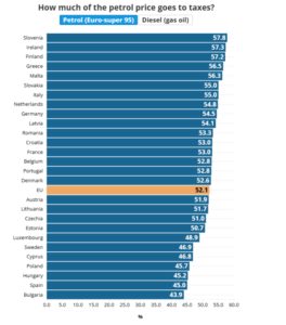 Within the EU, the share ranges from 43.9% in Bulgaria to 57.8% in Slovenia, with 20 member states whose total taxes account for more than 50% of the petrol price.