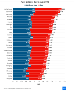 Taxes per litre range from €0.58 in Bulgaria to €1.24 in the Netherlands. According to Eurostat data on 16 March, the EU average was €0.96, and amounts exceeded €1 in Denmark, Germany, Finland, Greece, Ireland, and France.